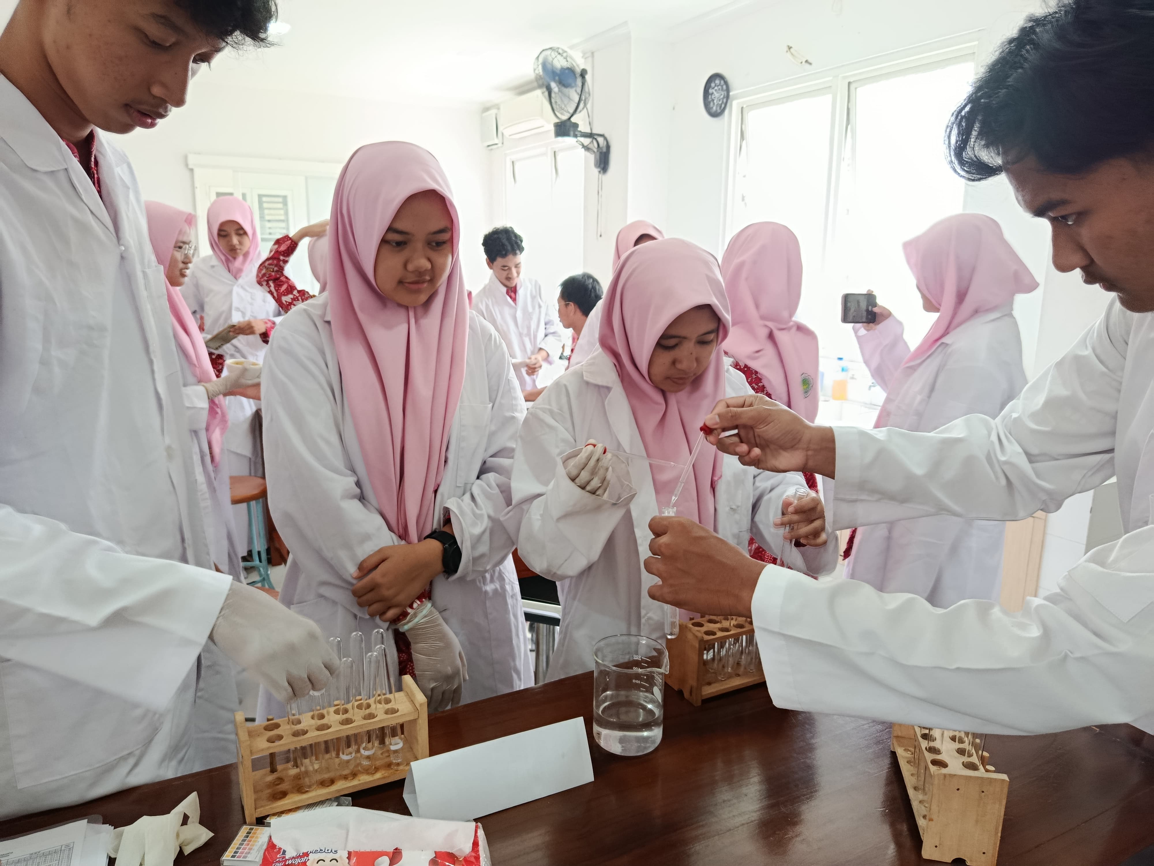 Tapi yang dipelajari minggu ini bukan cuma soal reaksi kimia. Praktikum ini juga melatih banyak hal penting: disiplin mengikuti prosedur lab, kesabaran menjalani tiap tahap, dan kerja sama dalam tim. Karena menggunakan reagen yang cukup pekat, siswa harus ekstra hati-hati dan saling membantu agar semua berjalan aman dan lancar.