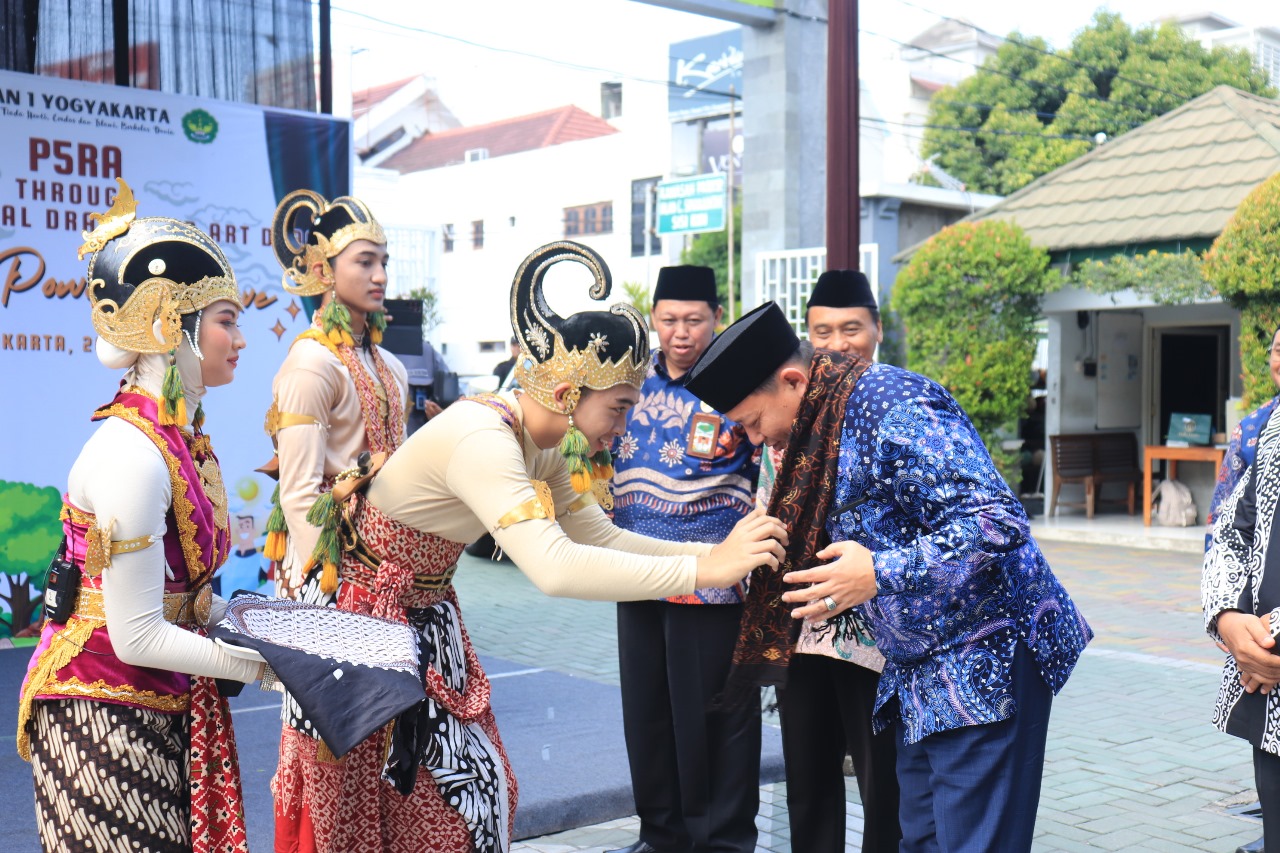 Yogyakarta (MAN 1 Yogya) -- Direktur KSKK Kemenag RI (Direktorat Kurikulum Sarana Kelembagaan dan Kesiswaan), Dr. H. Mochamad Sidik Sisdianto, M.Pd., meresmikan kegiatan kreativitas siswa siswi MAN 1 Yogyakarta yang bertajuk "Through English: Musical Drama and Art Dance", Kamis (20/6/2024). Bertempat di halaman MAN 1 Yogyakarta, acara ini merupakan bagian dari kegiatan P5RA dan upaya meningkatkan kemampuan bahasa Inggris siswa siswi MAN 1 Yogyakarta. Ia hadir didampingi oleh Kepala Kantor Wilayah Kemenag DIY beserta jajarannya, Kepala Kantor Kemenag Kota Yogyakarta beserta jajarannya, dan Kepala MAN 1 Yogyakarta.