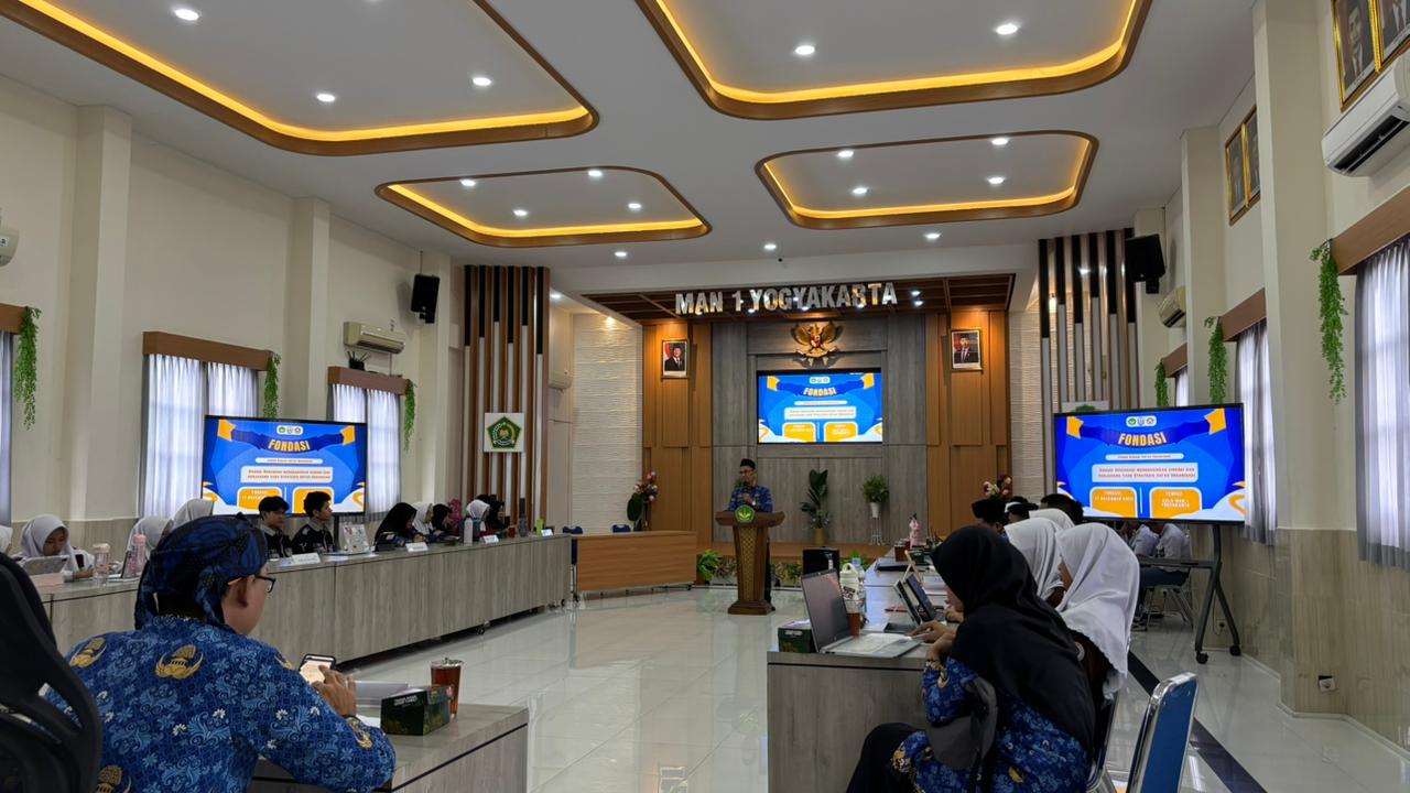 Yogyakarta (MAN 1 Yogya) – Dalam rangka mengawali masa kepengurusan organisasi periode 2025/2026, OSIS dan MPS MAN 1 Yogyakarta menyelenggarakan kegiatan tahunan FONDASI (Forum Diskusi Antar Organisasi) pada Senin (17/11/2025). Tahun ini, FONDASI mengangkat tema “Diskusi Berenergi Menghadirkan Sinergi dan Kerja Sama yang Strategis Antar Organisasi.”. Tema tersebut dipilih untuk menekankan pentingnya kolaborasi yang dinamis, saling mendukung, dan berfokus pada kemajuan madrasah.