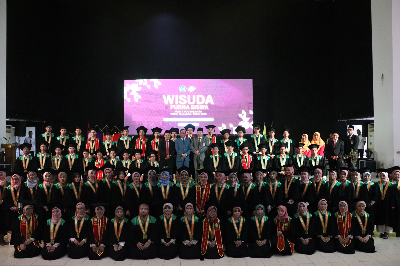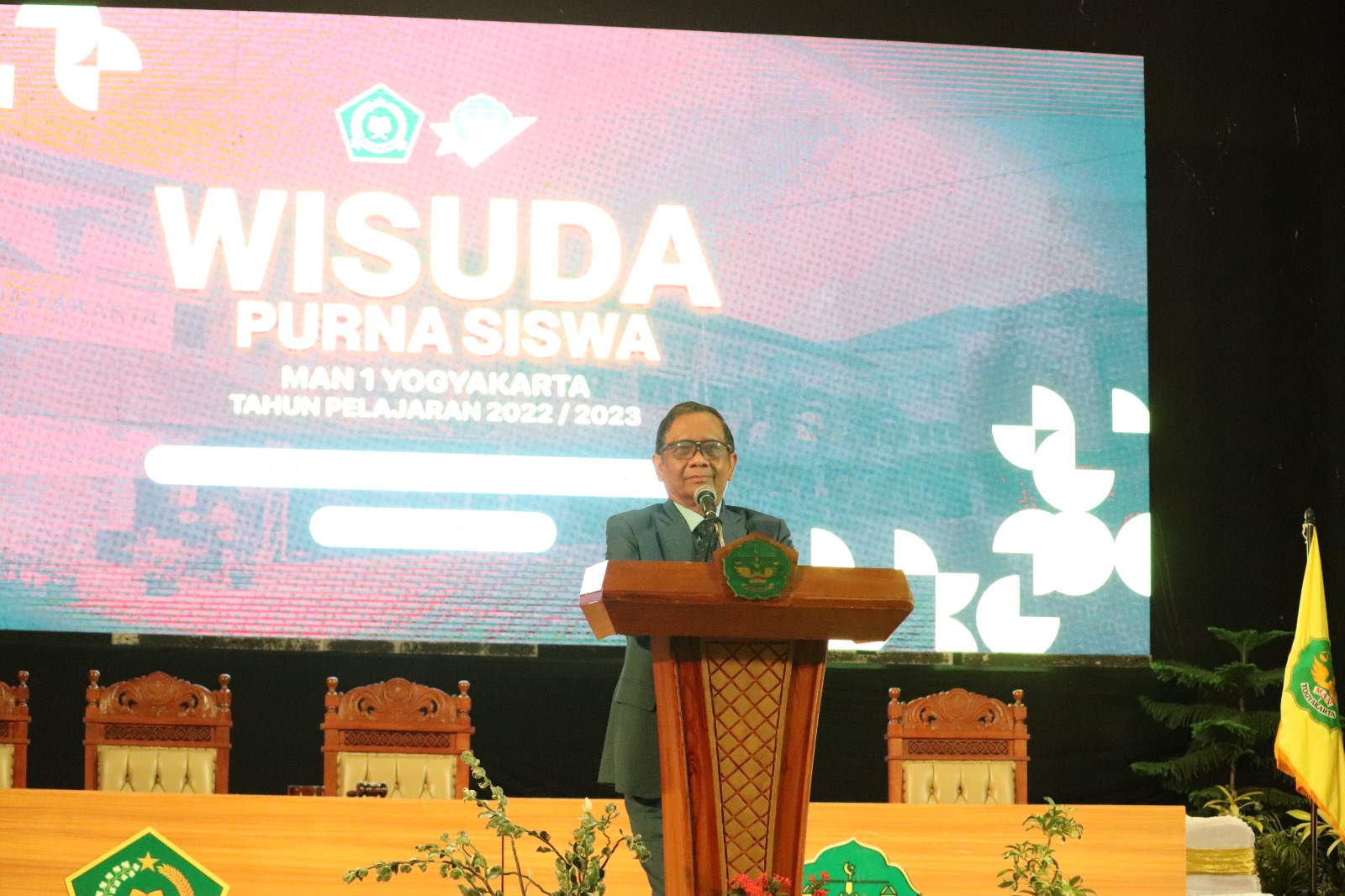 Yogyakarta (MAN 1 YK) -- Sebanyak 281 Siswa MAN 1 Yogyakarta mengikuti Wisuda Purna Siswa Tahun Pelajaran 2022/2023, Kamis (04/05/2023), di Gedung Multipurpose UIN Sunan Kalijaga Yogyakarta. Sungguh acara wisuda purna siswa tahun ini sangat istimewa, karena dihadiri langsung oleh Menteri Koordinator Bidang Politik, Hukum dan Keamanan (Menko Polhukam) Prof. Dr. Mohammad Mahfud MD, S.H., S.U., M.I.P. beserta jajarannya.