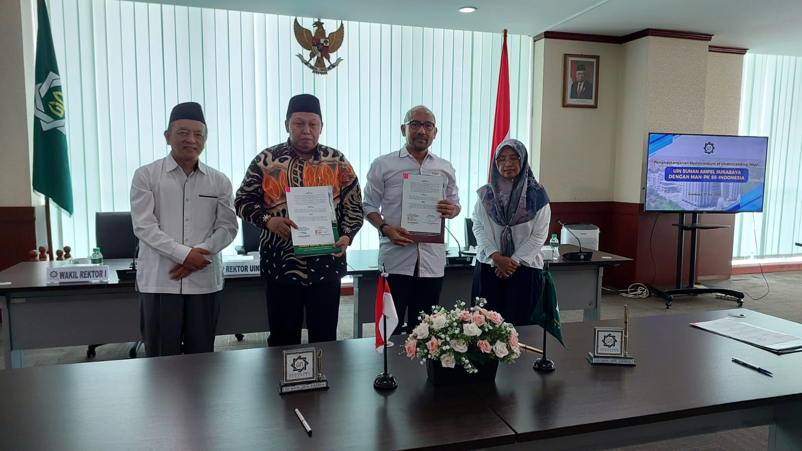 Komitmen tersebut ditandai dengan penandatanganan Memorandum of Understanding (MoU) dan Perjanjian Kerjasama dengan UINSA dengan MANPK se-Indonesia, Selasa (25/07/2023), di Ruang Rapat Lantai 2 Tower KH.Teunku Ismail Ya’kub UIN Sunan Ampel, Jalan A. Yani 117 Surabaya.