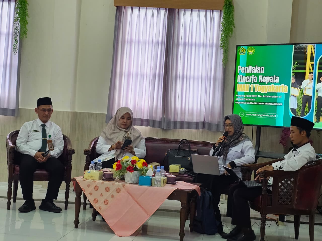 PKKM tahun ini dipimpin oleh Hj. Elfa Tsuroyya, S.Ag., M.Pd.I., M.Pd., Kepala Seksi Pendidikan Madrasah Kantor Kementerian Agama Yogyakarta, selaku Ketua Tim Penilai. Turut hadir sebagai asesor, Evi Effrisanti, S.TP., serta Ma’ruf Yuniarno, S.Pd.I., MA., keduanya merupakan Pengawas Madrasah Kementerian Agama Kota Yogyakarta. Dalam sambutannya, Bahar Rozak, S.H., Kepala Tata Usaha MAN 1 Yogyakarta, menyampaikan apresiasi atas kerja sama tim dalam mempersiapkan dokumen dan bukti dukung PKKM. Ia berharap penilaian tahun ini mampu meraih hasil lebih baik dibandingkan tahun-tahun sebelumnya.