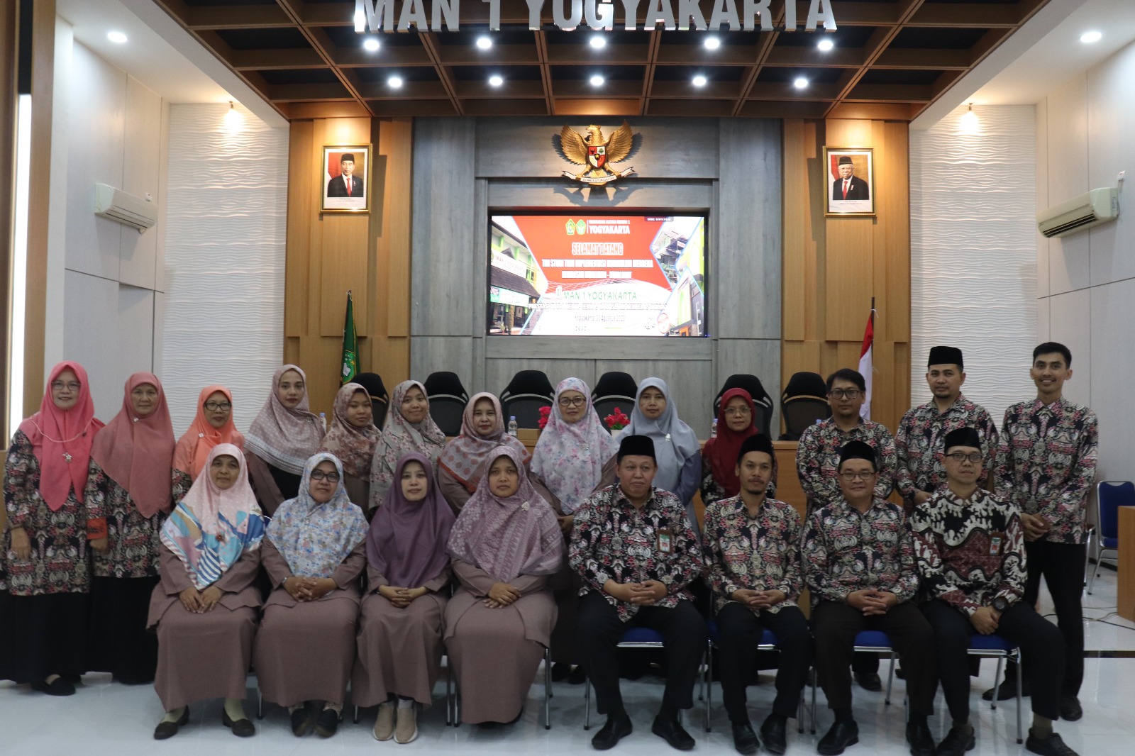 Penyambutan rombongan tamu dipimpin langsung oleh Kepala Madrasah MAN 1, Drs. H. Wiranto Prasetyahadi, M.Pd. Beberapa jajaran struktural MAN 1 YK juga ikut mendampingi prosesi penyambutan, yaitu Wakamad Bidang Kesiswaan Soeprastiyono, M.Pd.I., Wakamad Bidang Humas Dr. Suyanto, M.Pd., Wakamad Bidang Kurikulum Taufik Zamhari, M.Sc., Kanit Pontren Latifah Rahmawati, M.A., dan segenap guru MAN 1 Yogyakarta.