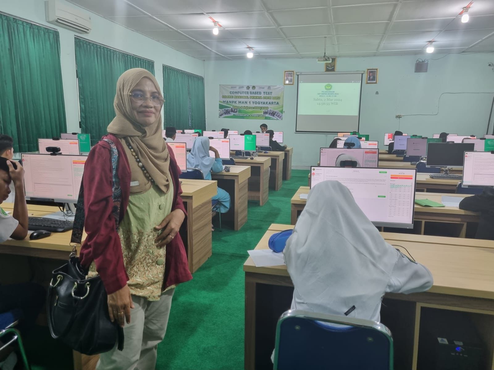 Ketua Tim Kurikulum dan Kesiswaan Bidang Pendidikan Madrasah Kanwil DIY, Hj. Anita Isdarmini, M.Hum. turut hadir di MAN 1 Yogyakarta yang disambut langsung oleh Kepala MAN 1 Yogyakarta Drs. H. Wiranto Prasetyahadi, M.Pd.. Kehadirannya bermaksud memonitoring berjalannya tes SNPDB di MAN PK MAN 1 Yogyakarta.