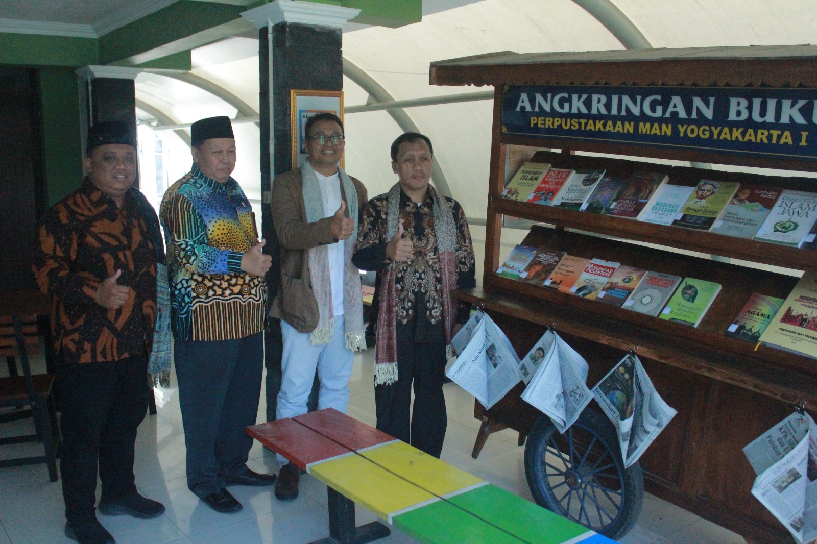 Tim Juri mengelilingi area MAN 1 Yogyakarta untuk melihat terapan moderasi beragama. Kepala Madrasah dan jajarannya ikut mendampingi ke beberapa spot yaitu Ruang Konseling Keagamaan dan Moderasi Beragama, Angkringan Buku Moderasi Beragama, dan poster-poster terkait Moderasi Beragama.