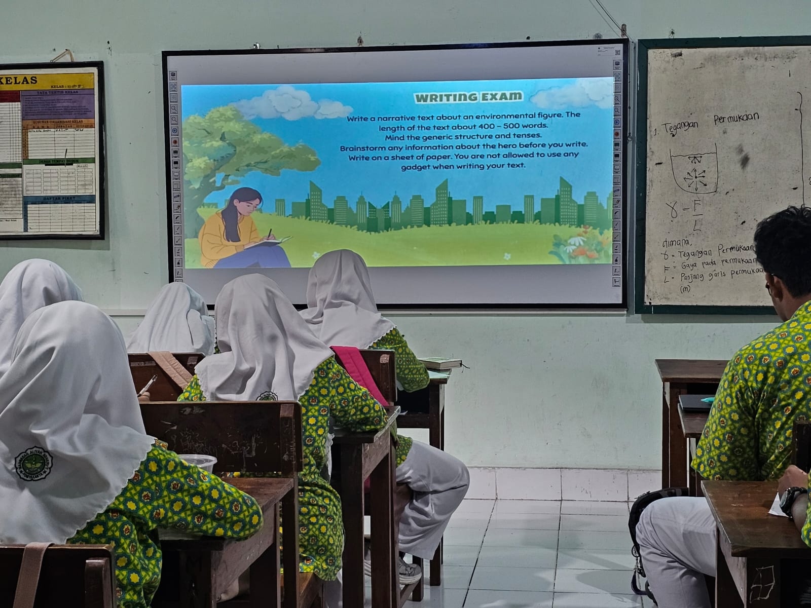 Sementara itu, kelas XI mendapatkan tantangan yang berbeda. Mereka diminta menulis Narrative Text bertema “Environmental Figures”, yakni kisah tentang tokoh-tokoh yang berkontribusi terhadap pelestarian lingkungan. Tulisan tersebut harus memiliki panjang minimal 400 kata, sehingga murid dituntut mampu membangun alur cerita yang runtut sekaligus inspiratif.