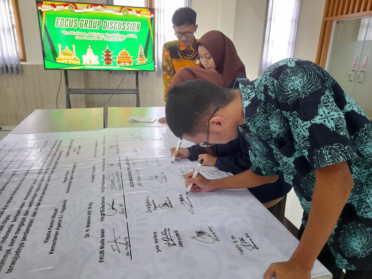 Yogyakarta (MAN 1 YK) -- Bertempat di MAN 1 Yogyakarta, Jumat (22/09/2023), Pelajar Kota Yogyakarta membacakan dan menandatangani deklarasi anti radikalisme. Kegiatan berlangsung sebagai penutup dialog lintas agama yang digelar di aula Al Hakim MAN 1 Yogyakarta.