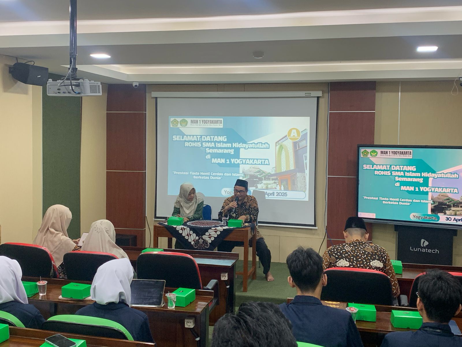 Kota Yogyakarta (MAN 1 Yogyakarta)– MAN 1 Yogyakarta menerima kunjungan studi tiru dari pengurus ROHIS SMA Islam Hidayatullah Semarang pada Rabu (30/4/2025). Kegiatan yang berlangsung di ruang Multimedia lantai 3 Gedung SBSN tersebut menjadi ajang berbagi inspirasi dan pengalaman dalam dunia organisasi keislaman di lingkungan sekolah.
