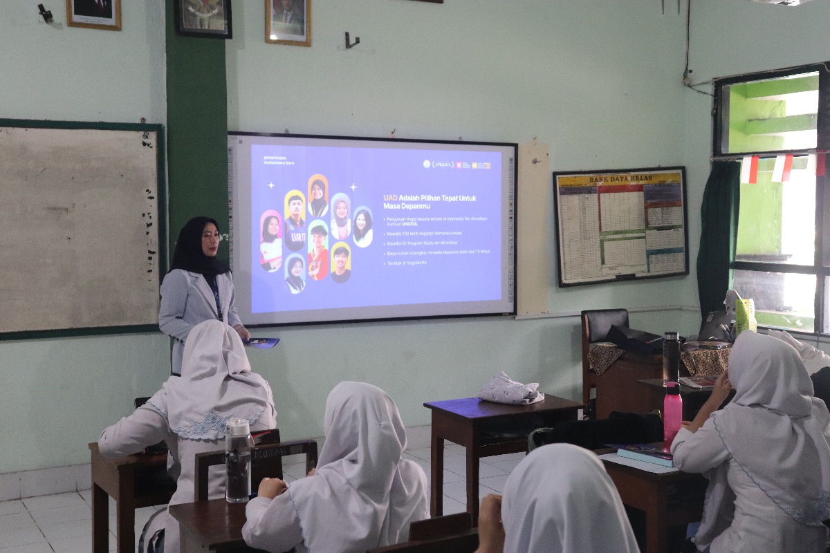 "Mengapa harus UAD?," demikian Yoga memulai sosialisasinya. Menurutnya, UAD merupakan perguruan tinggi swasta di Indonesia yang terletak di Yogyakarta dengan akreditasi unggul. UAD memiliki 61 program studi terakreditasi beserta 100 lebih kegiatan kemahasiswaan. "Semua bisa kuliah di UAD" demikian jargon perguruan tinggi ini. Yoga dan teman-temannya memberikan sosialisasi tersebut bertempat di kelas-kelas pada jam KBM ke-7-8 dan 9-10. Sosialisasi ini terbagi dalam dua sesi. Sesi pertama pada jam KBM 7-8 di kelas XII PK1, XII PK2, XIIA, XII B, dan XII C. Sedangkan sesi kedua, dilaksanakan pada jam KBM 9-10 di kelas XII C, XII D, XII E, XII F, dan XII G.